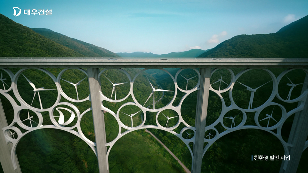 파도 치는 해변가, 바다 위 줄지어 설치된 거대 풍력발전기의 모습이 보입니다. 배경이 바뀌고 녹음이 짙은 험준한 산과 산 사이에 지어진 다리 교각 사이마다 미학적 문양을 띈 풍력발전기들이 거대한 프로펠러를 움직이고 있습니다. 인공적인 설치물 임에도 주변 자연과 일체의 위화감 없이 조화를 이룬 모습이 매우 인상적입니다. 현재 해상풍력발전 부유체 독자 기술개발 속도에 박차를 가하고 있는 대우건설이 진즉이 생각하는 다음 세대의 친환경 풍력 발전 사업의 모습입니다.