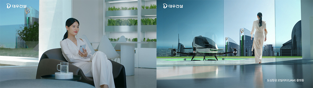 미래 푸르지오에 사는 입주민들의 생활은 어떻게 변화할까요? 모델이 앉은 소파 뒤로 온도, 습도를 자동 조절해 채소를 재배하는 푸르지오 만의 스마트팜이 슬쩍 비칩니다. 대우건설은 최근 실증연구 업무협약을 체결로 발전소 부생열과 CO2를 활용해 식물을 재배하는 융복합 스마트팜 연구를 시작하며 근미래에 누리게 될 프리미엄 라이프스타일에 더욱 기대감을 고조하고 있는데요. 여기서 끝이 아닙니다. 소파에서 일어난 모델이 펜트하우스 루프에 설치된 버티포트로 발걸음을 옮기자, 고층 건물들의 스카이라인을 배경으로 세련된 디자인의 승용 드론이 대기하고 있습니다. 푸르지오 입주자들이 도심항공 모빌리티(UAM) 플랫폼을 통해 승용 드론으로 편안히 이동하며 하이테크 라이프를 영위하게 하고자 하는 대우건설의 청사진을 담겨 있습니다.