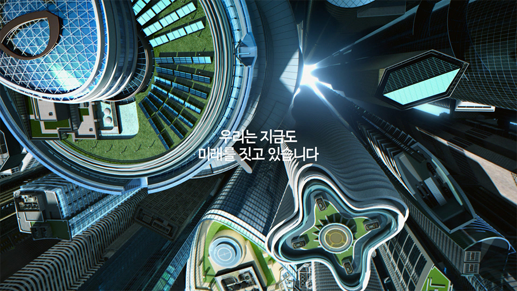 이어 모델 시선 방향으로 과거부터 미래까지 이끌어갈 대우건설의 선도적 위상이 담긴 “우리는 지금도 미래를 짓고 있습니다”라는 문구가 나옵니다. 미래적 디자인의 건축물들이 웅장하게 솟아오르고, 태양의 높이까지 뻗어 나오는 거대한 건축물의 모습을 통해 대우건설의 위대한 가능성, 즉 ‘Great possibility’ 정신을 보여주며 영상은 마무리됩니다.