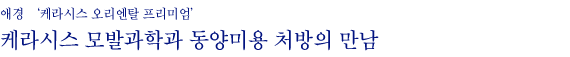 오리엔탈 뷰티 에센스라는 말은 다소 생소할 수도 있지만, 동백오일과 같은 맥락에서 예로부터 전해오던 헤어케어에 유용한 성분들을 현대에 맞게 처방한 케라시스 오리엔탈 프리미엄만의 특징이다. 동백잎, 당귀, 인삼, 천궁, 석류, 백급 등 천연 활성 성분이 뛰어나 두피보호, 탈모 방지에 도움을 주는 한방 원료 혼합물로서 모근강화성분[특허 제 10-2007-10798]까지 들어있어 그 효과를 더해준다.