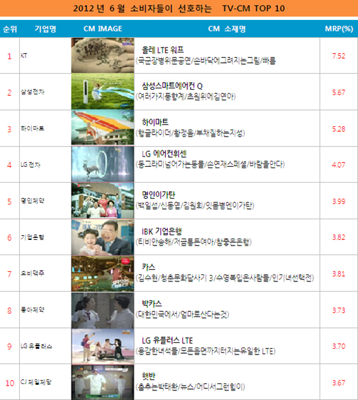 olleh LTE WARP 16% 광고비로 소비자가 좋아하는 광고 Top 1에 선정 한국CM전략연구소는 2005년 5월부터 방송되는 모든 TV CM을 대상으로 소비자의 호감도를 조사해오고 있다. 10세에서 59세 남녀 소비자 1,200명을 대상으로 최근에 본 TV광고 중 ‘좋아하는 CM’의 내용과 브랜드에 대해 업종 구분 없이 자발적으로 상기해서 기록하도록 함으로써, 실제 TV시청환경을 기반으로 한 소비자 마음 속 광고효과를 측정하고 있다. 또 집행된 광고비 대비 광고효율성을 평가하고, 브랜드 가치와 마찬가지로 TV CM의 경제적 가치(CM Value)를 평가 분석하고 있다. 2012년 상반기를 마무리하는 6월에는 어떤 광고들이 소비자의 마음을 사로잡았을까? 6월 한달 지상파TV에만 500편이 넘는 광고가 집행되었고, 6월 소비자들이 선호하는 광고는 약 650으로 나타났다. 이 중, 소비자들이 가장 좋아하는 광고는 KT의 olleh LTE WARP ‘국군장병위문공연’편이 선정되었다. 이어서, 삼성하우젠에어컨이 2위, 하이마트가 3위, LG에어컨휘센이 4위를 차지했다. ![]()