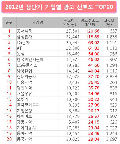 한국CM전략연구소는 2005년 5월부터 방송되는 모든 TV CM을 대상으로 소비자의 호감도를 조사해오고 있다. 10세에서 59세 남녀 소비자 1,200명을 대상으로 최근에 본 TV광고 중 ‘좋아하는 CM’의 내용과 브랜드에 대해 업종 구분 없이 자발적으로 상기해서 기록하도록 함으로써, 실제 TV시청환경을 기반으로 한 소비자 마음 속 광고효과를 측정하고 있다. 또 집행된 광고비 대비 광고효율성을 평가하고, 브랜드 가치와 마찬가지로 TV CM의 경제적 가치(CM Value)를 평가 분석하고 있다. 불황의 그늘이 짙었던 2012년도 벌써 절반이 지났다. 경기 침체로 소비자들의 지갑이 가벼워면서 소비 트렌드가 많이 바뀌었다고 한다. 세계 경제 위기와 장기 불황이 심각했던 2012년 상반기. 이런 악조건 속에서 어떤 광고들이 소비자들의 사랑을 받았을까? 동서식품, 2012년 상반기 광고 선호도 1위 기업