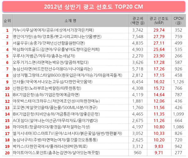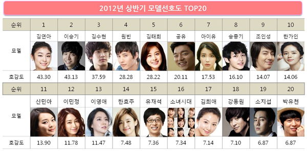 2012년 소비자들이 가장 선호한 광고는 공유가 출연한 동서식품 카누 ‘사무실의 여자’편으로나타났다. 2위는 명인이가탄 ‘송해/강호동’편이 차지했고, 3위는 서울우유 ‘송중기’편으로 나타났다. 동서식품 ‘카누’를 시작으로 커피, 우유, 라면과 같은 식음료 광고 다수가 높은 광고 선호도를 얻어 상위권에 대거 포진되어 있다. 특히 커피와 라면 카테고리는 광고 경쟁이 치열했던 만큼 여러 편의 광고가 높은 순위로 나타났다. 한편, 상반기 광고 선호도 상승이 눈에 띄는 광고는 IBK기업은행으로 금융권 모델로는 파격적으로 ‘송해’를 기용하여 광고 Creative를 전개, 2012년에 집행 된 2편의 광고 모두 높은 순위로 나타났다. 반대로, 수송기기와 정보통신 카테고리는 많은 비용을 광고비로 집행하였으나 이들 광고가 광고 선호도 상위권에 오르는데는 실패하여 타 카테고리를 포함한 전체 광고물과의 경쟁력은 떨어지는 것으로 나타났다. ![]() 이승기를 제치고 김연아, 소비자들이 가장 선호하는 모델 1위 ![]() 2011년 하반기에는 이승기가 소비자들이 가장 좋아하는 모델로 뽑혔으나, 2012년 상반기에는 김연아가 이승기를 제치고 1위 자리에 올랐다. 2011년 주춤하던 김연아의 인기는 2012년에 하이트아이스포인트, 프로스펙스W, 맥심화이트골드의 모델로 발탁되면서 빠르게 상승하여 10위에서 1위로 큰 상승폭을 보였다. 이어서, 이승기가 김연아와 근소한 차이로 소비자들이 두 번째로 좋아하는 모델로 뽑혔다. 세 번째로 소비자들이 선호하는 모델은 김수현으로, 김수현은 2012년 상반기 모델 선호도가 급격하게 상승한 대표적인 모델이다. 드라마 ‘해를 품은 달’의 높은 인기로 다양한 카테고리의 광고 모델로 발탁이 되어 활발하게 활동하고 있다. 여자 모델 중에서는 이민정의 상승세가 가장 뚜렷하다.