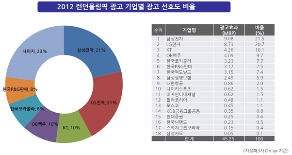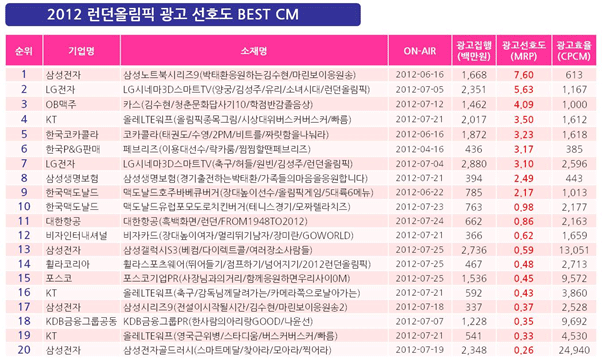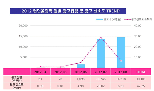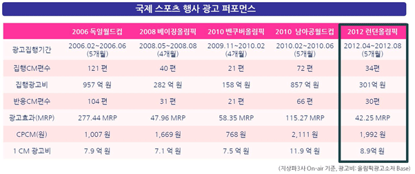 한국CM전략연구소는 2005년 5월부터 방송되는 모든 TV CM을 대상으로 소비자의 호감도를 조사해오고 있다. 10세에서 59세 남녀 소비자 1,200명을 대상으로 최근에 본 TV광고 중 ‘좋아하는 CM’의 내용과 브랜드에 대해 업종 구분 없이 자발적으로 상기해서 기록하도록 함으로써, 실제 TV시청환경을 기반으로 한 소비자 마음 속 광고효과를 측정하고 있다. 또 집행된 광고비 대비 광고효율성을 평가하고, 브랜드 가치와 마찬가지로 TV CM의 경제적 가치(CM Value)를 평가 분석하고 있다. 국제적인 스포츠행사인 2012 런던올림픽이 7월 28일 시작되어 지난 8월 13일에 폐막하였다. 기업들은 4년만에 개최된 올림픽 이슈를 놓치지 않고 이를 소재로 한 다양한 광고를 선보였다. 한국CM전략연구소에서는 2012 런던올림픽을 이슈로 활용한 광고를 모아 광고 선호도를 분석해보았다. ![]() 최근 7년간 집행 된 국제스포츠행사의 광고 퍼포먼스를 비교해보면, 올림픽보다는 월드컵에 적극적으로 광고를 집행해왔고, 광고 선호도도 올림픽 대비 월드컵이 매우 높은 수준으로 나타났다. 2012 런던올림픽 역시, 2010년 남아공월드컵 대비 광고집행 규모 및 광고 선호도가 낮게 나타나 우리 나라에서는 올림픽보다 월드컵 마케팅 경쟁이 훨씬 더 치열함을 알 수 있다. ![]() 2012 런던올림픽 광고는 2012년 4월에 시작되어 8월까지 약 5개월 간 집행되었고, 특히 올림픽 기간인 7월과 8월에 광고집행이 집중되었다. 7월과 8월 광고비 규모는 큰 차이가 없으나 광고 선호도는 큰 차이를 보이고 있다. 7월에는 광고 선호도 29.02 MRP를 획득하였으나, 8월에는 7월의 1/4 수준인 6.52 MRP를 획득하는데 그쳤다. 실제 2012 런던올림픽 기간은 7월 28일부터 8월 13일로, 올림픽 시작 전인 7월에 광고 선호도가 훨씬 높게 나타났다. 따라서, 올림픽 광고를 집행할 때에는 올림픽이 끝난 후에 하는 것보다 올림픽 시작 전에 광고를 집행하여 올림픽 개최로 형성된 기대감을 적극적으로 활용하는게 유리하다고 볼 수 있다. ![]() 2012 런던올림픽에 총 18개 기업이 광고를 집행하였는데, 이 중 삼성전자의 광고 선호도가가장 우수하다. 이어서 LG전자, KT가 2위, 3위를 차지했다. 이들 3개 기업의 광고가 런던올림픽 광고 선호도의 절반 이상을 점유하였다. 전기전자 업종을 비롯하여 맥주, 음료, 패스트푸드, 금융, 항공사 등 다양한 업종의 기업에서 올림픽 광고를 집행한 것이 특징이다. ![]() 광고물 중에서는 34편의 올림픽 광고 중, 삼성노트북 ‘마린보이 응원송’편이 가장 높은 광고 선호도를 확보하였다. 금번 런던올림픽의 경우 유명 연예인 또는 스포츠 스타가 출연한 광고가 전반적으로 높은 광고 선호도를 확보하였고, 경기 전 선수들을 응원하는 메시지를 담은 광고 다수가 눈에 띄었다. 특히, 박태환은 삼성노트북, 삼성생명보험, 삼성카드 광고에 출연하여 높은 인기를 실감케했다. |