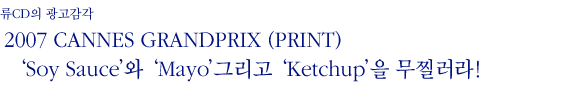 올해도 칸의 크리에이티브는 우리를 실망시키지 않았다. 물론 몇 광고들은 냉정한 광고인들로부터 어김없이 ‘야유굴욕’을 겪기도 했다. 오늘은 우선 Print Lions 부문에서 그랑프리를 차지한 광고를 소개하고자 한다. 항상 그랬듯이 좋은 광고, 뛰어난 크리에이티브와 마주한다는 것은 S씨의 비밀부엌에 차려진 맛있는 요리를 기다리는 마음 못지 않게 설레며, 롸씨의 아름다움과 마주하는 것처럼 기분 좋은 일임에 틀림없다.