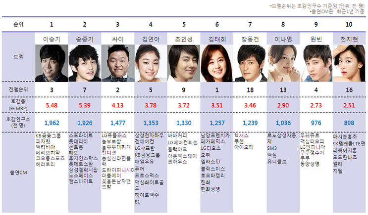 한국CM전략연구소는 2005년 5월부터 방송되는 모든 TV CM을 대상으로 소비자의 호감도를 조사해오고 있다. 10세에서 59세 남녀 소비자 1,200명을 대상으로 최근에 본 TV광고 중 ‘좋아하는 CM’의 내용과 브랜드에 대해 업종 구분 없이 자발적으로 상기해서 기록하도록 함으로써, 실제 TV시청환경을 기반으로 한 소비자 마음 속 광고효과를 측정하고 있다. 또 집행된 광고비 대비 광고효율성을 평가하고, 브랜드 가치와 마찬가지로 TV CM의 경제적 가치(CM Value)를 평가 분석하고 있다. 소비자들은 어떤 광고 모델을 좋아할까? 한국CM전략연구소의 조사 결과, 2월 소비자들이 가장 좋아하는 모델은 이승기로 나타났다. 2위는 송중기, 3위는 싸이로 나타나, 최근 남자 광고모델이 강세임을 다시 한번 확인시켜주었다. 여자 모델 중에서는 김연아가 가장 높은 순위를 차지했다. <2013년 2월 광고 모델 TOP10>